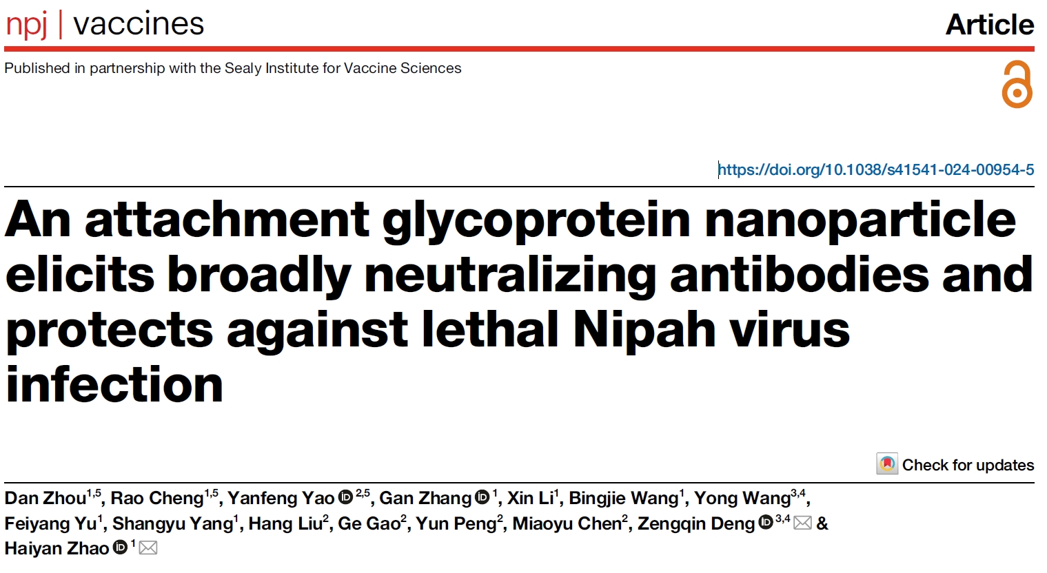 An attachment glycoprotein nanoparticle elicits broadly neutralizing antibodies and protects against lethal Ni pa h virus infection, npj Vaccines, 2024
