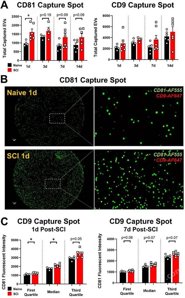 研究人员进一步比较了SCI组和对照组的血浆外泌体变化,结果表明,在损伤后1d的时间点,CD81外泌体数量相对对照组更高,与Western Blot的结果一致;而CD9外泌体数量则没有统计学差异,与流式分析的结果一致(图2A&B)。基于图2H的CD81与CD9有大量的荧光共定位,检测CD9外泌体的CD81荧光强度,由1d的荧光强度中位数差异可知,