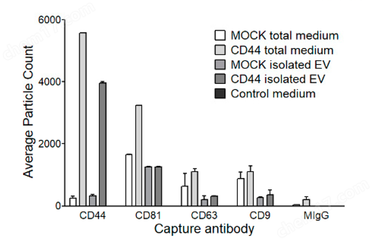 其中,研究人员使用Exoview检测了MKN74细胞的未经纯化的培养基及分离纯化后的外泌体中的含CD44以及其他标记物的含量。结果表明,相对于对照组,MOCK(CD44敲除)细胞组在未经纯化的培养基及分离纯化后的分泌外泌体的数量显著降低。以上结果表示ExoView可以直接对复杂环境的培养基进行检测,无需分离纯化步骤,且检测结果具有*特异性。